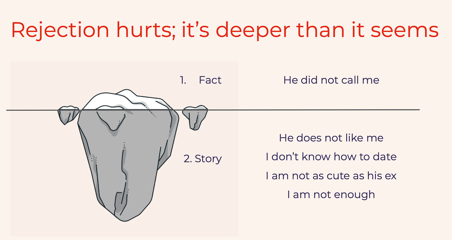So the pain we experience with rejection isn’t just “they rejected” (fact). It becomes “this says something about who I am” (story). So the fact+story makes the rejection seem bigger than it is.